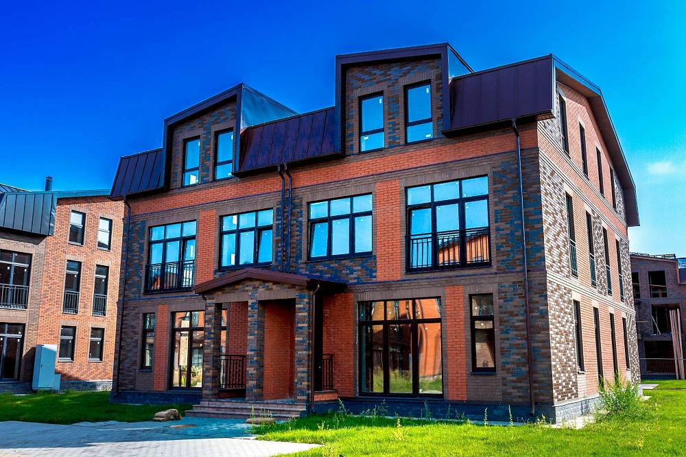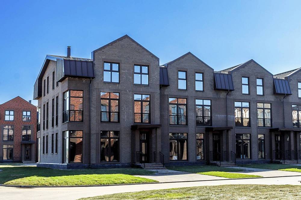 Таунхаусы без отделки площадью 75 м2 с дополнительным мансардным этажом 37 м2 с полноценной высотой потолков. Все окна - французские балконы в пол. В помещениях много света, фасад решен в современном стиле Лофт. Материал стен - экологически чистый кирпич премиум-качества марки Porotherm. Фасад из керамического облицовочного кирпича Kerma Premium контрастных цветов и фактуры. Кровельная система кликфальц. Ламинированные под текстуру дерева стеклопакеты из ПВХ профиля. Больше преимуществ новой очереди поселка смотрите по ссылке.