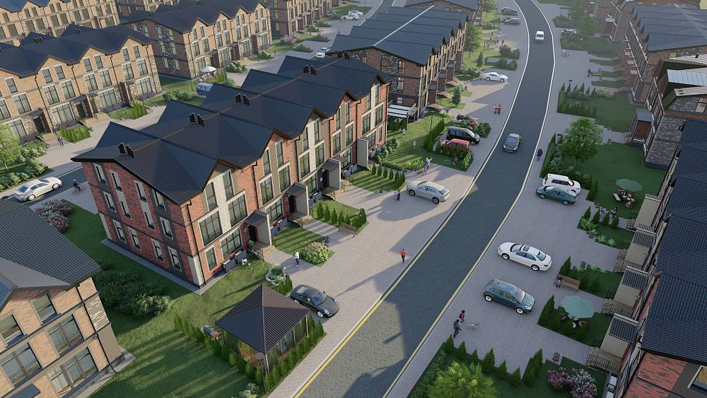 Квадрохаус рассчитан на проживание всего 4-х семей: мало соседей – больше приватности! Квадрохаусы без отделки площадью 105 м² дополнительно имеют полноценный мансардный этаж площадью 52 м² с высотой потолков более трех метров. Панорамные окна создают внутри полное света пространство. Все окна второго этажа и мансарды – «французские балконы» в пол. На первом этаже можно построить террасу с прямым выходом из гостиной. Увеличенный земельный участок. Рядом с каждым таунхаусом – два парковочных места.